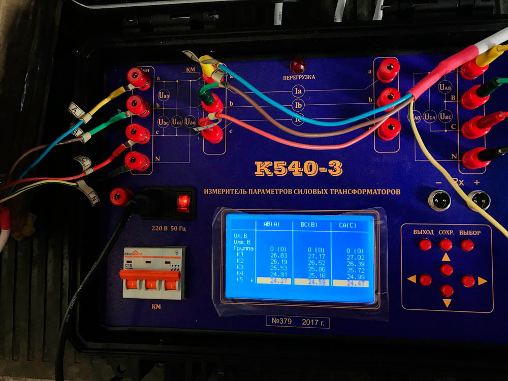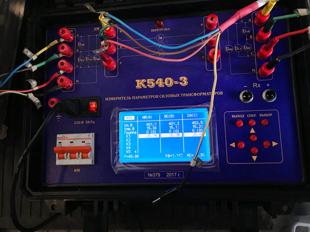 - Измерение коэффициента трансформации при трёхфазном и однофазном возбуждении трансформатора;