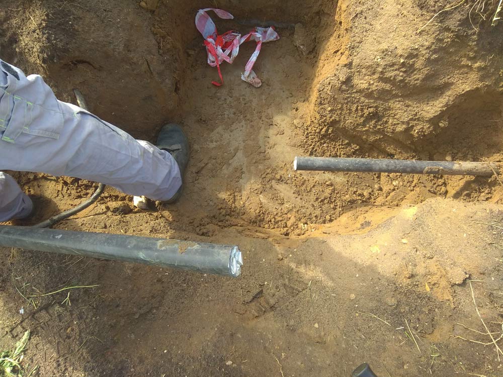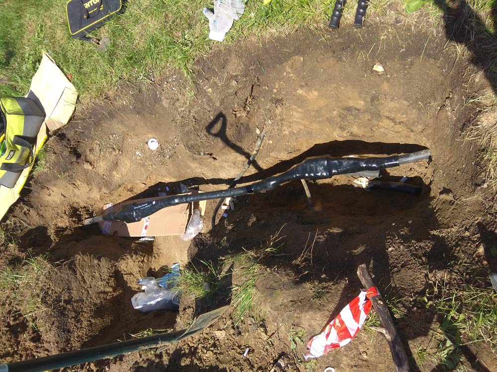 Установка двух соединительных муфт и вставка из куска кабеля на поврежденном участке.