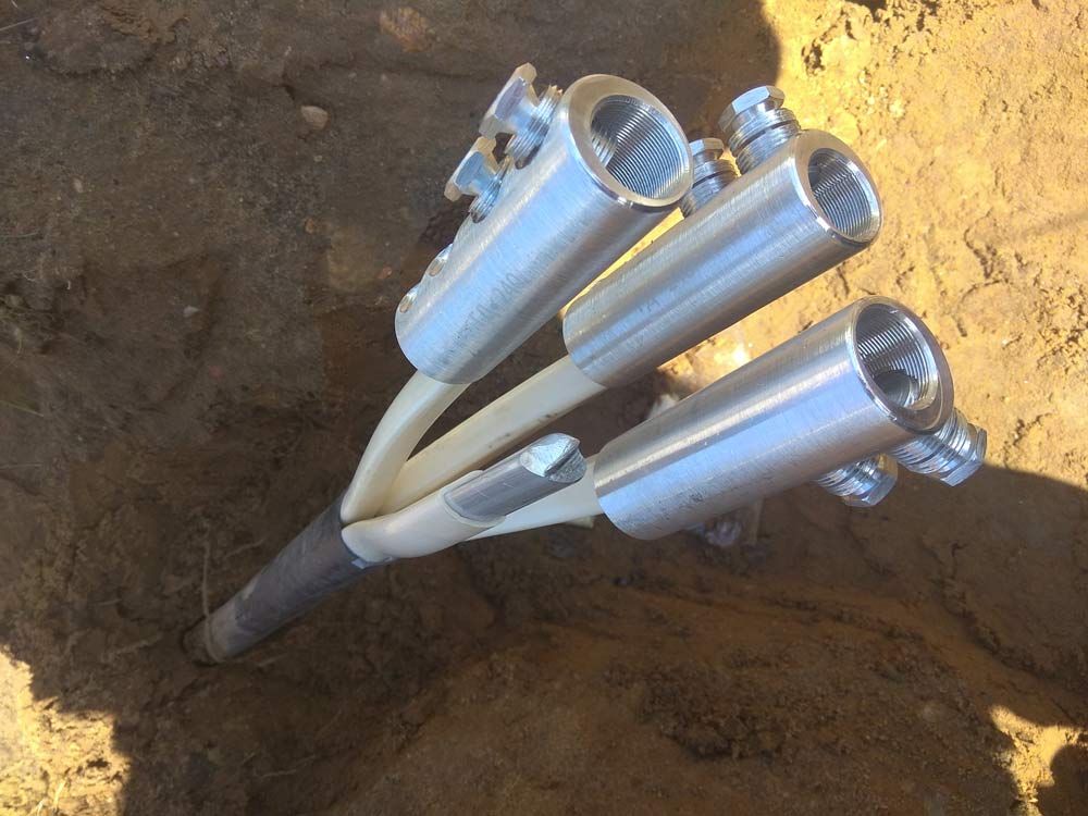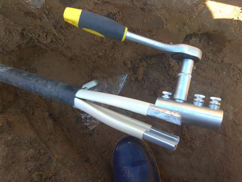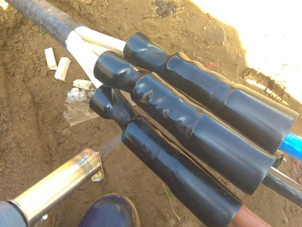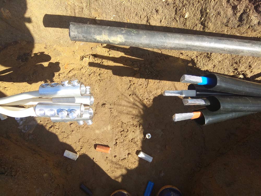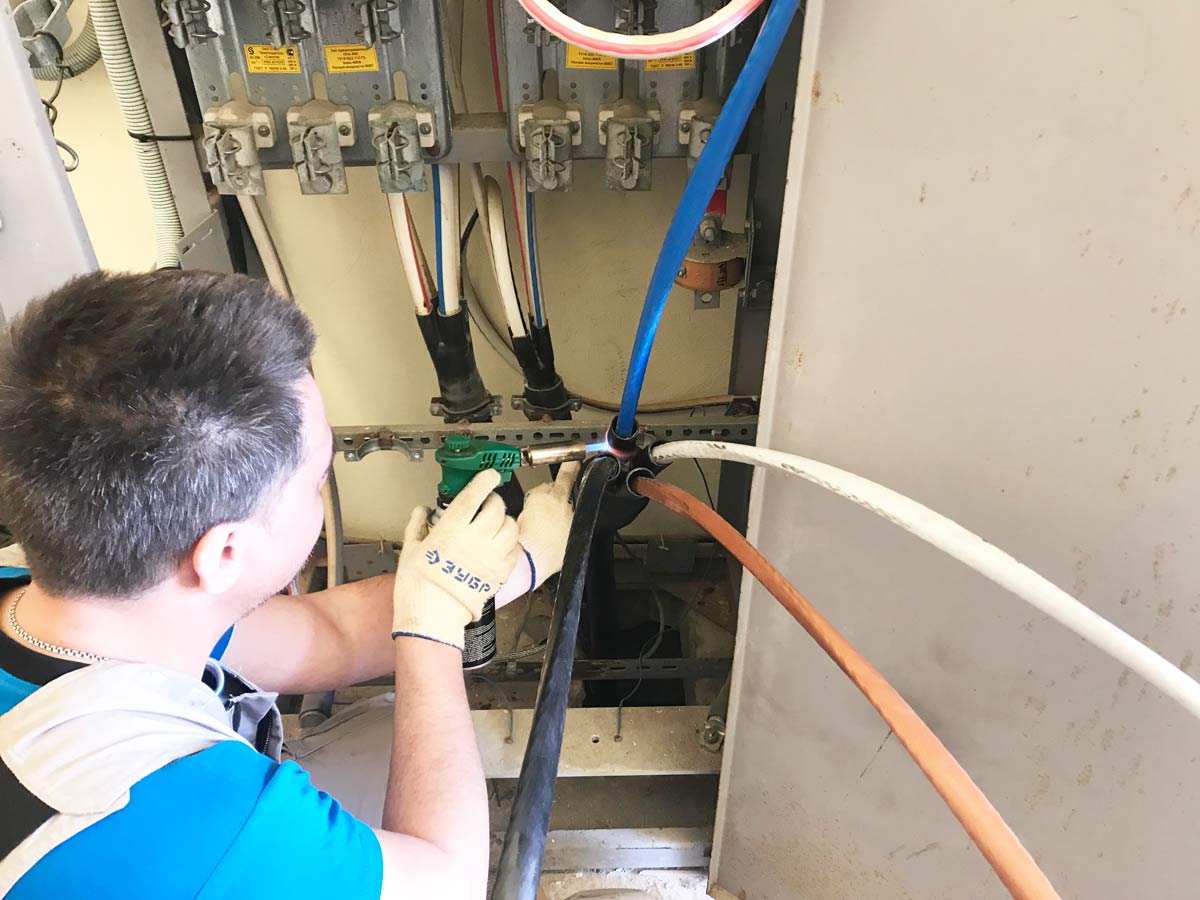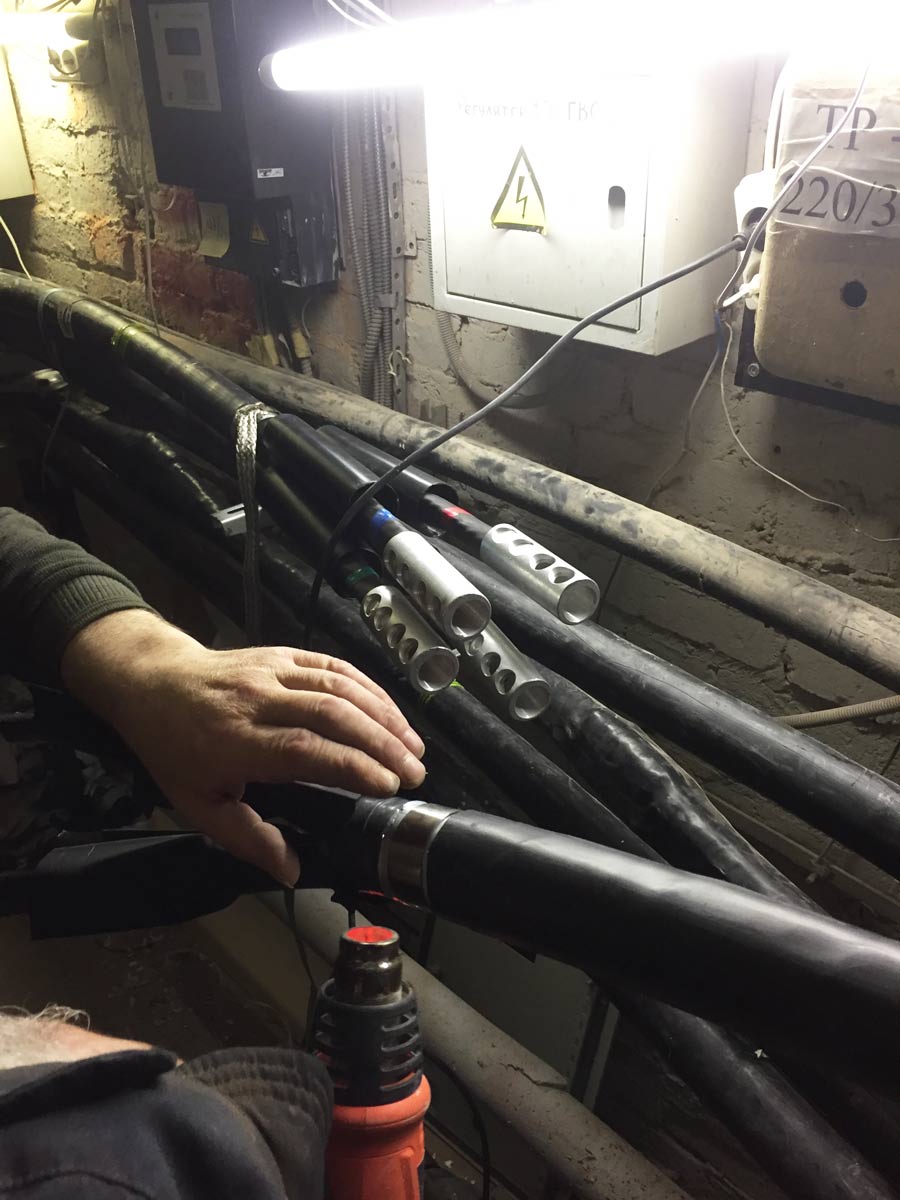 - Выезд на объект, материал (кабельная перчатка клеевая, наконечники, термоусаживаемая трубка клеевая, черная и цветная, пружина постоянного давления, тросик заземления), установка муфты, испытание.